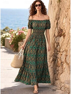 Femmes Robe maxi Robe trapèze Robe d'été Occasionnel Quotidien Coupe régulière Fleuri Manche Courte Épaules Dénudées Bleu Noir Blanche Vert Claire Été Printemps Automne