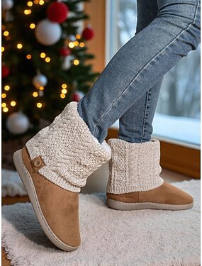 Bottines d'hiver en similicuir marron pour femme – détail de bouton de manchette en tricot, doublure en peluche, chaussures décontractées confortables pour l'intérieur et l'extérieur