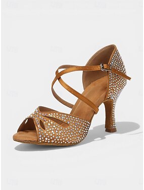 Escarpins de danse latine pour femmes, couleur beige, ornés de strass - chaussures de salsa à brides scintillantes