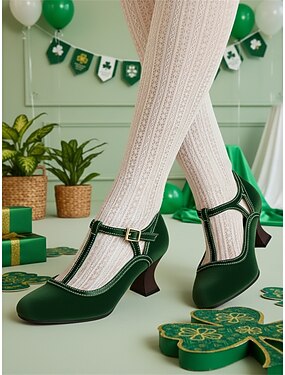 Escarpins à bride en T en velours vert pour femmes – chaussures d'inspiration vintage pour la Saint-Patrick, les fêtes et les célébrations.