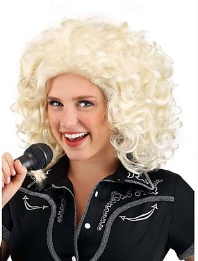 Perruque blonde bouclée volumineuse pour femme, style disco années 70-80, coiffure de star de la pop pour soirée costumée.