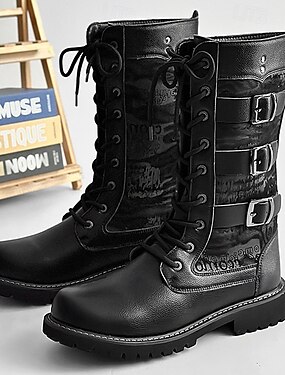 Bottes de combat noires en similicuir pour homme – style militaire à lacets hauts et sangles à boucle pour motard, mode gothique, performance sur scène et Halloween