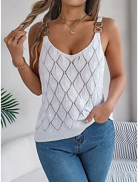Femmes Tops tricotés côtelés Débardeur T-shirt Boucle en métal Couleur Unie Mode Élégant Classique Sans manches Col en V Hauts Réguliers Quotidien Sortir Week-end Noir Blanche Orange Marron Vert Ét