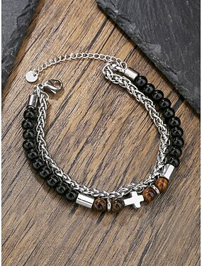 Bracelet bohème double rang pour homme, en acier inoxydable et pierre naturelle, orné d'une croix et de perles. Idéal au quotidien, pour les vacances à la plage ou en vacances.