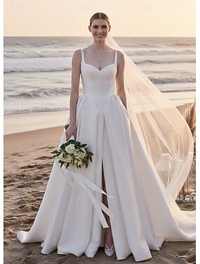 Robes de mariage décontractées Hall robe A-line à décolleté en V sans manches traîne balayée en satin robes de mariée avec plis