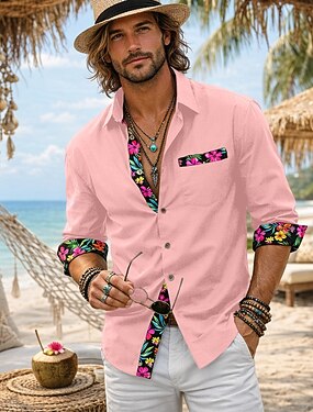 chemise homme en lin, chemise d'été, chemise de plage, chemise boutonnée, chemise à fleurs, style bohème décontracté, noir, blanc, rose, gris, manches longues, col à revers, été, printemps &vêtements