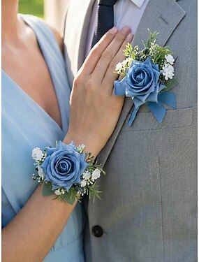 Ensemble boutonnière et bracelet de mariée pour homme, en polyester bleu clair à motif floral artificiel, idéal pour les mariés, les bals de fin d'année, les fêtes et les soirées formelles.