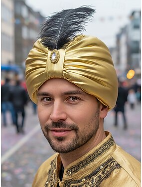 Chapeau Métallique en Polyester Doré de Mardi Gras pour Hommes avec Plume et Broche - Tête de Costumes de Prince Sultan ou Arabe pour Carnaval et Mascarade