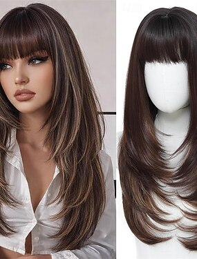 Perruque brune avec mèches et frange pour femme, perruque longue ondulée brune, perruque brune dégradée de 66 cm (26 pouces)