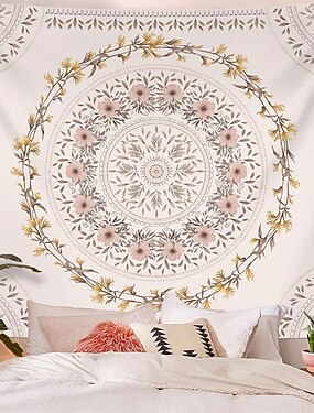 Tapisserie murale crème à motif floral neutre mandala rose, feuilles brunes et fleurs roses, motif botanique circulaire, idéale pour une chambre, une tête de lit, un salon ou une chambre d'étudiant.
