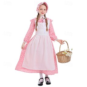 250e anniversaire des États-Unis 19ème siècle années 1800 Robe Prairie Ensemble bonnet et tablier Manches longues Fille pionnière Epoque Coloniale Pionnier Guerre d'indépendance américaine Fleuri