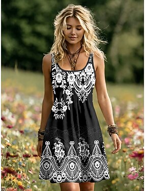 Robe Mini Femme Robe Boho Robe A Ligne Robe Sans Bretelles Vacances Casual Plage Sortie Regular Fit Graphique Floral Tribal Sans Manches Col U Bleu Blanc+Noir Rose Violet Été Printemps