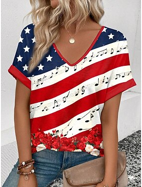 Jour de l'Indépendance Américaine Femmes T-shirt Bloc de Couleur Imprimé Graphique Drapeau ancien Élégant Classique Manche Courte Col en V Hauts Réguliers Quotidien Week-end Vêtements de vacances