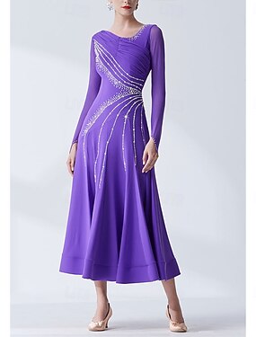 Danse de Salon Robe Strass Plis Épissage Femmes Soirée Entraînement Performance manche longue Haut Spandex Polyester