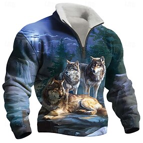 Homme Animal Loup Polaire Sweatshirt Mode Occasionnel 3D Col montant Zip quart Extérieur Vacances Cadeau Vêtements de rue Bleu Bleu 1 Bleu 3# Bleu 2# Demi-zip Automne Hiver Designer S M L XL XXL XXXL