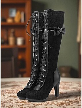 Bottes hautes en dentelle noire d'inspiration victorienne des années 1890 pour femmes, avec nœud et talons décoratifs, pour des rassemblements vintage élégants et des soirées à thème &événements
