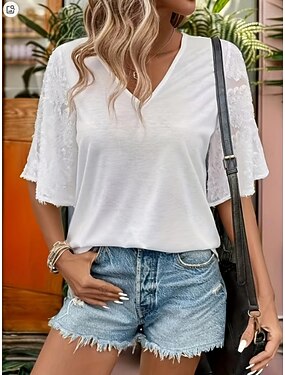 Femmes T-shirt Haut d'épissage en dentelle Dentelle Couleur Unie Élégant Classique Occasionnel Demi Manches Col en V Hauts Réguliers Quotidien Sortir Week-end Blanche Été Printemps