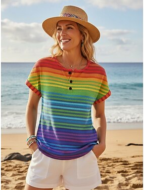 Femmes T-shirt Imprimé Boutons de poitrine Graphique Arc-en-ciel Rayé Élégant Classique Moderne Manche Courte Henley Hauts Réguliers Quotidien Arc-en-ciel Été Printemps