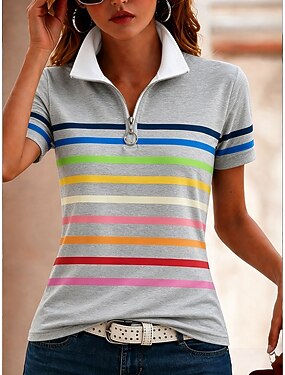 Femmes T-shirt Fermeture éclair Quart de zip Rayé Graphique Bloc de Couleur Rayé ancien Tropical Hawaïen Manche Courte Col haut Hauts Réguliers Mariage à la plage Occasionnel Quotidien Bleu Blanche