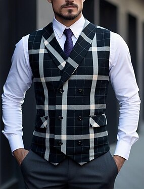 Homme Gilet Tenue de cocktail Formel Mariage Vacances Affaires Mode Classique Printemps Automne Avec Poches Boutons Polyester Confortable Plaid Simple Boutonnage Col en V Coupe régulière Noir Marron