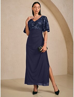 Ligne A Longueur au sol Robes de Bal Robe de Soirée Tenue de soirée Élégant Bloc de Couleur Fente Haute Demi Manches Col en V Mariage Formel Satin Satin Extensible avec Noeud(s) Plis