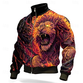 Homme Lion Flamme Veste Sweatshirt Frais Quotidien Fantaisie Tactique Col montant Extérieur Vêtements de rue Soirée Violet Orange Vert Zip Up Printemps Automne Designer S M L XL XXL XXXL