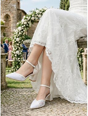 Escarpins Mary Jane en dentelle ivoire pour femme, à petits talons et boucle – bout rond, élégants escarpins de mariée à petit talon pour les mariages en intérieur, les réceptions formelles et les mariées romantiques.