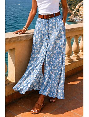 Femmes Jupe de vacances Occasionnel Boho Midi Taille Basse Jupes Fleuri Floral Imprimé Fendu Non Elastique Rue Sortir Bleu Ciel Été