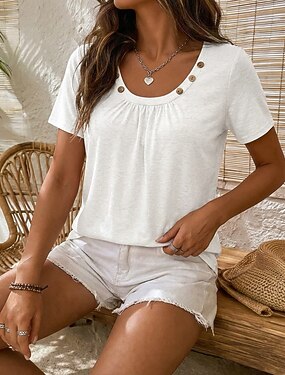 Tunique pour femme 100% coton boutons graphique uni élégante à manches courtes col rond régulier sortant au quotidien blanc rose kaki gris été printemps automne