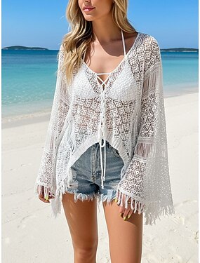 Femmes Chemise Bohème Chemise en Dentelle Tunique Haut à œillets Cordon de serrage Crochet Uni Vacances Chaussures de plage Manche cloche Col en V Quotidien Rue Noir Blanche Kaki Été