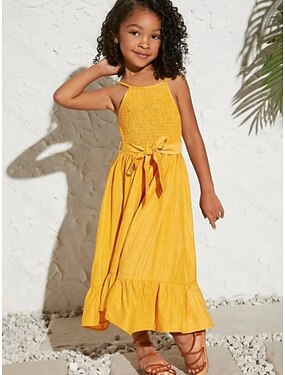 Enfants Fille Robe Couleur Unie Sans manches Occasionnel Extérieur Soirée Patchwork Adorable Occasionnel Costume Polyester Maxi Robe à bretelles Été Printemps 4 ans et + Jaune