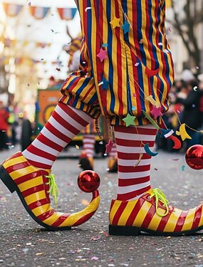 Chaussures de clown rayées pour hommes de Mardi Gras rouges et jaunes à bout pointu avec un talon courbé amusant ajustement confortable parfaites pour le carnaval et les costumes de clown