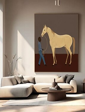 Grande peinture à l'huile abstraite sur toile représentant un cheval blanc et une jeune fille. Art mural minimaliste représentant un animal, idéal pour le salon.