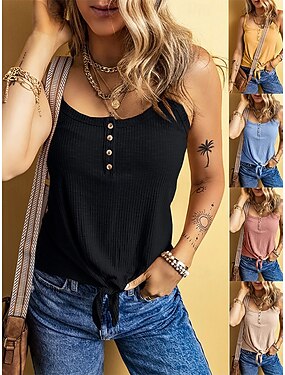 Femmes Débardeur T-shirt sans manches T-shirt Boutons Devant Couleur Unie Mode Classique Occasionnel Sans manches Col en U Hauts Réguliers Quotidien Sortir Week-end Rouille rouge Noir Jaune Vert