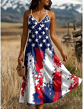 Jour de l'Indépendance Américaine Femmes Robe maxi Robe trapèze Robe Nuisette Vacances Occasionnel Plage Sortir Coupe régulière Graphique Étoiles et rayures Sans manches Col en V Bleu Rouge Ét