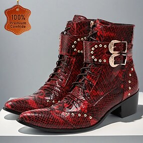 Bottines en cuir à imprimé serpent rouge pour hommes avec sangles à double boucle et détails rivetés, bottes western 100 % cuir de vache pour concerts et spectacles