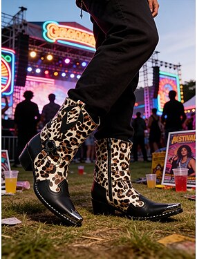 Bottes de festival pour hommes en cuir véritable, imprimé léopard pour festivals de musique