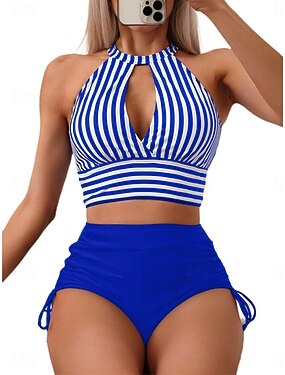 Maillot de bain 2 pièces bikini femme briefs colorblock ajusté sans dos vacances plage rayé col halter sans manches