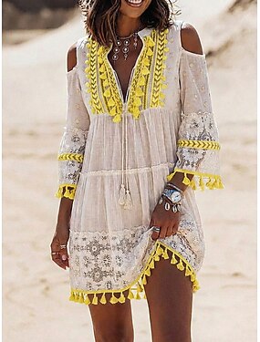 Femmes Mini robe Robe bohème Robe en Dentelle Robe Blanche Robe d'été Élégant Mode Plage Vacances Fête Coupe régulière Uni Manche 3/4 Col en V Bleu Blanche Jaune Rose Claire Été Printemps