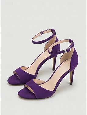 Sandales à talons aiguilles en daim violet pour femme, avec bride cheville et bout ouvert, idéales pour un cocktail ou un mariage. &événements en soirée