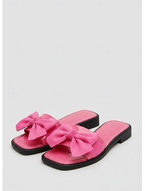 Sandales plates à nœud rose vif pour femmes - élégantes mules à bout carré ornées de gros nœuds décoratifs, parfaites pour les vacances dans des hôtels de luxe ou les escapades à la plage. &détente