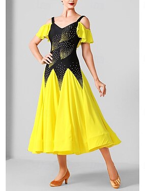 Danse de Salon Robe Strass Plis Épissage Femmes Soirée Entraînement Performance Manche Courte Haut Spandex Polyester
