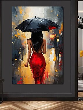 Peinture à l'huile faite main représentant une femme élégante et sensuelle en robe rouge avec un parapluie. Toile imprimée, ambiance romantique par temps de pluie, idéale pour décorer une chambre ou