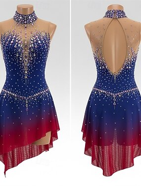 Robe de patinage artistique Femmes Patinage Robe Bleu Rouge Patchwork Dos Nu Élastique Entraînement Compétition Tenue de Patinage Classique cristal pailleté Sans manches Patinage sur glace Patinage
