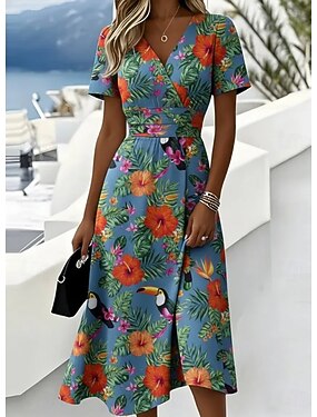 Femmes Robe Midi Robe fourreau Vacances Occasionnel Boho Coupe régulière Fleuri Graphique Manche Courte Col en V Bleu Été Printemps