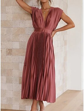 Femmes Robe Midi Robe trapèze Robe Plissée Élégant Fête cocktail Extérieur Soirée robe demoiselle d honneur Plissé Coupe régulière Couleur Unie Manche Courte Col en V Noir Champagne Rouge