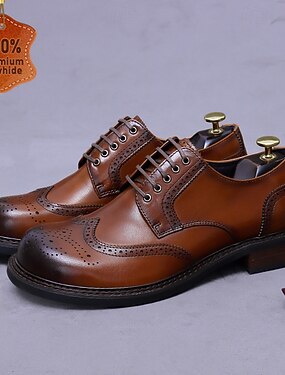 Chaussures Oxford en cuir marron pour homme - Richelieus en cuir de vachette pleine fleur de première qualité avec détails à bouts d'aile, design classique à lacets pour tenues d'affaires, réunions