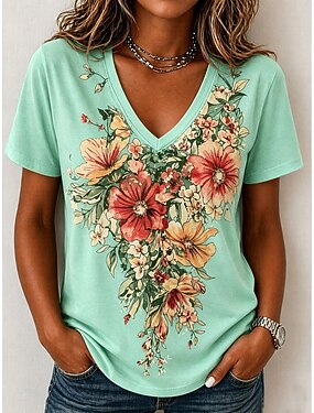 Femmes T-shirt Imprimé Graphique Plantes Élégant Classique Occasionnel Manche Courte Col en V Hauts Réguliers Occasionnel Quotidien Bleu Beige clair Violet Claire Violet Vert Été Printemps