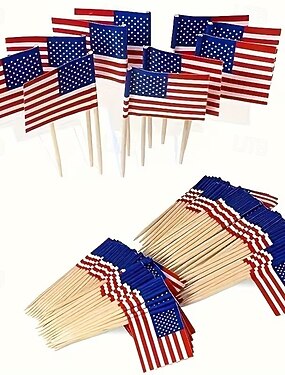 100/200 drapeaux américains à insérer dans des cure-dents en bois ou en papier, parfaits pour décorer gâteaux, vins de dessert ou autres occasions.