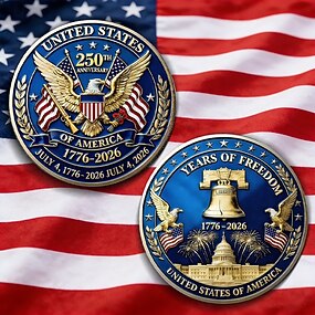 Pièce commémorative du 250e anniversaire des États-Unis, ornée d'aigles majestueux et portant la mention « 250e anniversaire », célébrant la liberté américaine. Objet de collection.